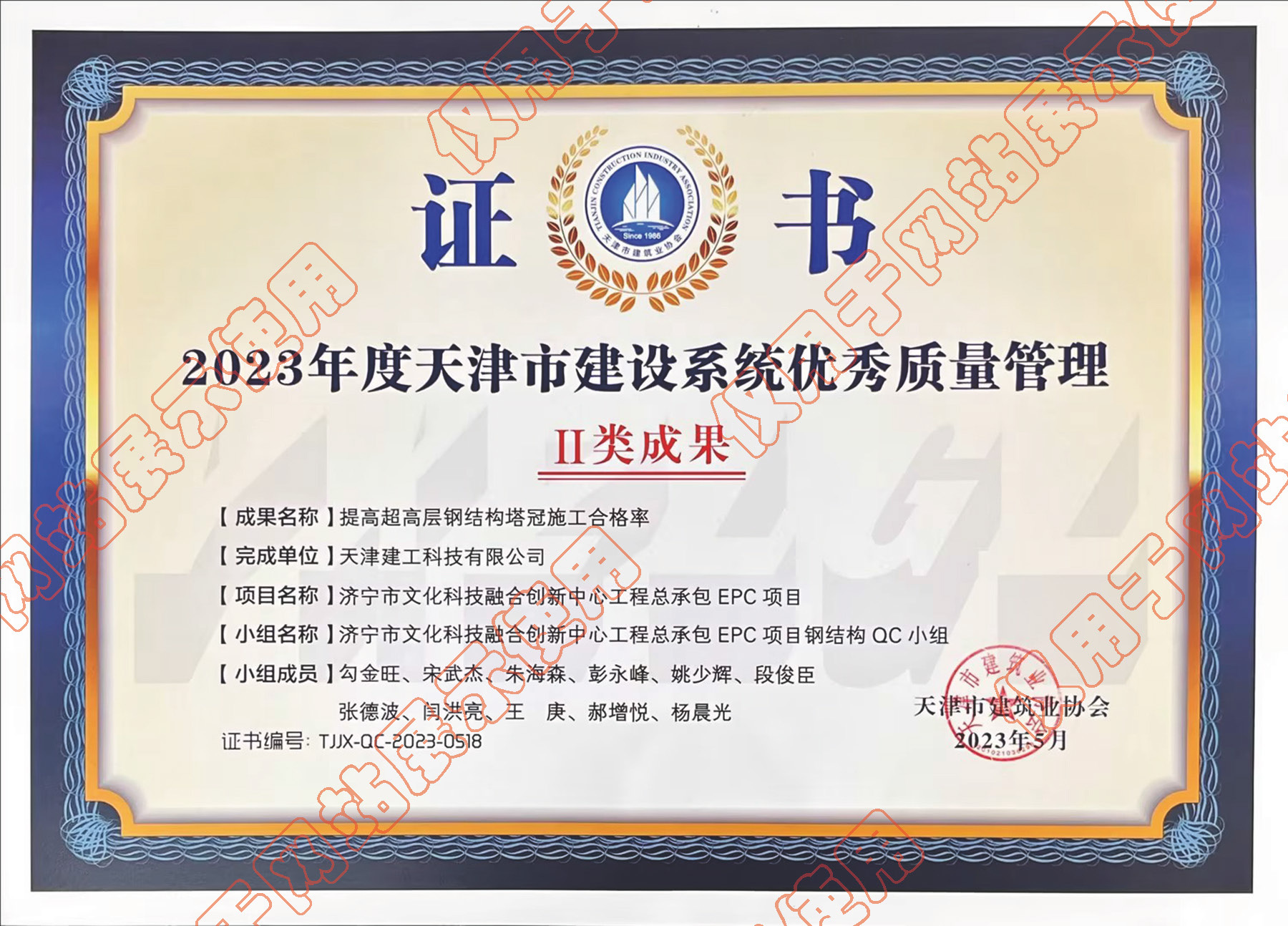 2023年度天津市建設系統優秀質量管理Ⅱ類成果_提高超高層鋼結構塔冠施工合格率