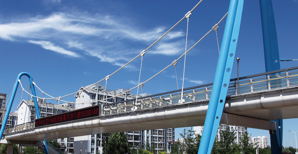 工程位于天津市西青區,一號人行天橋為鋼結構雙塔懸索橋。